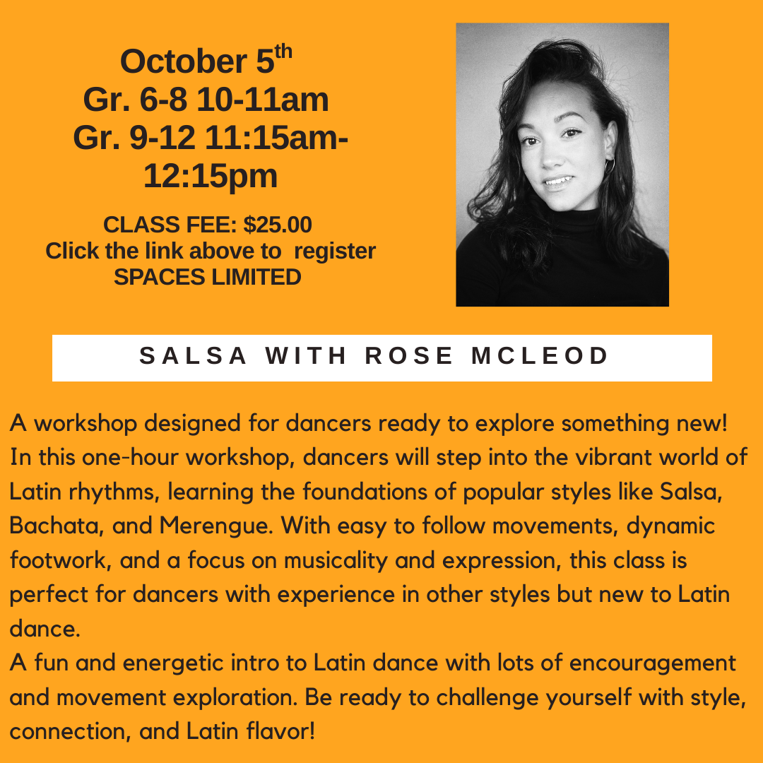 In this one-hour workshop, dancers will step into the vibrant world of Latin rhythms, learning the foundations of popular styles like Salsa, Bachata, and Merengue. With easy to follow movements, dynamic footwork, and a focus on musicality and expression, this class is perfect for dancers with experience in other styles but new to Latin dance.